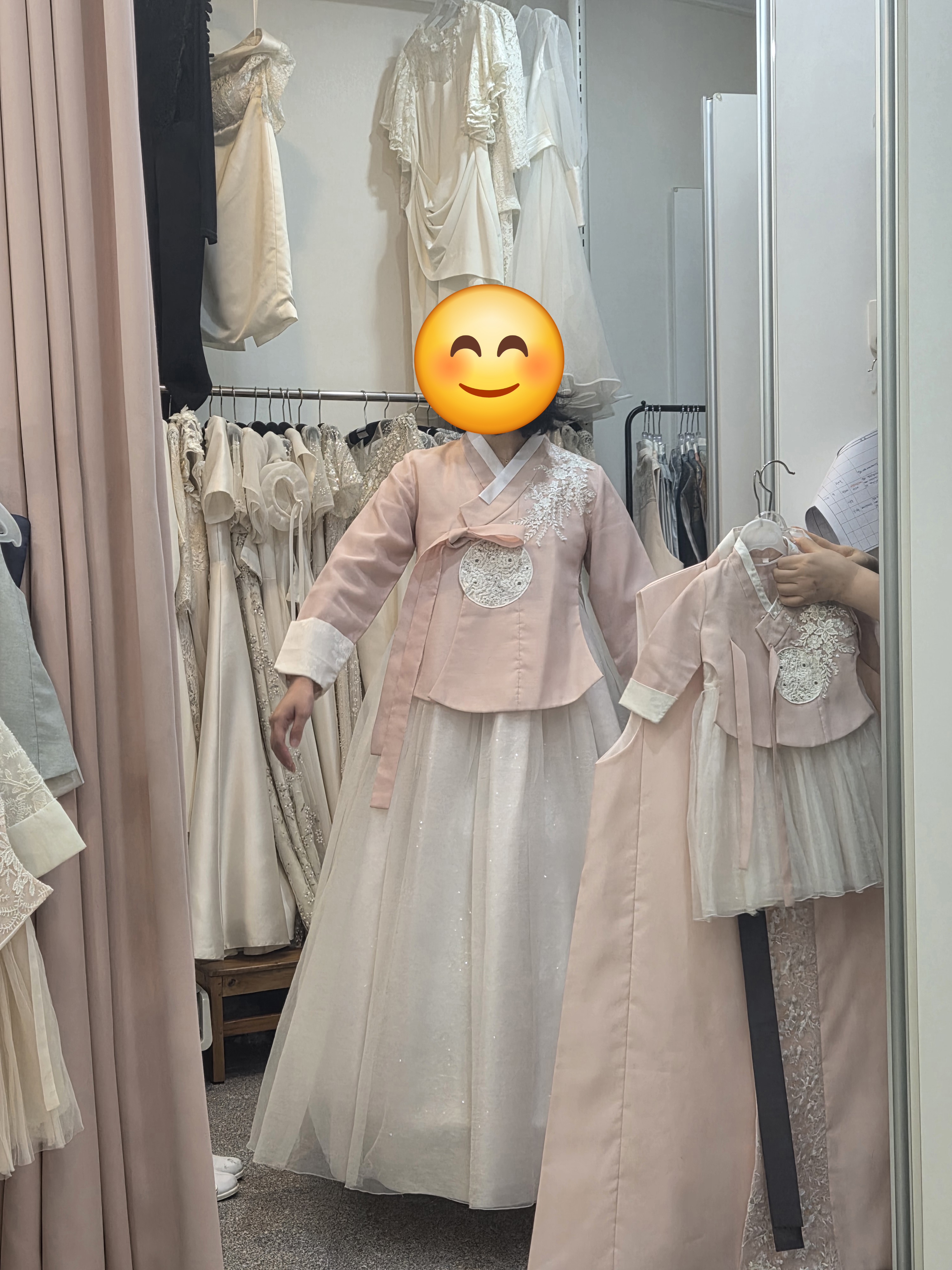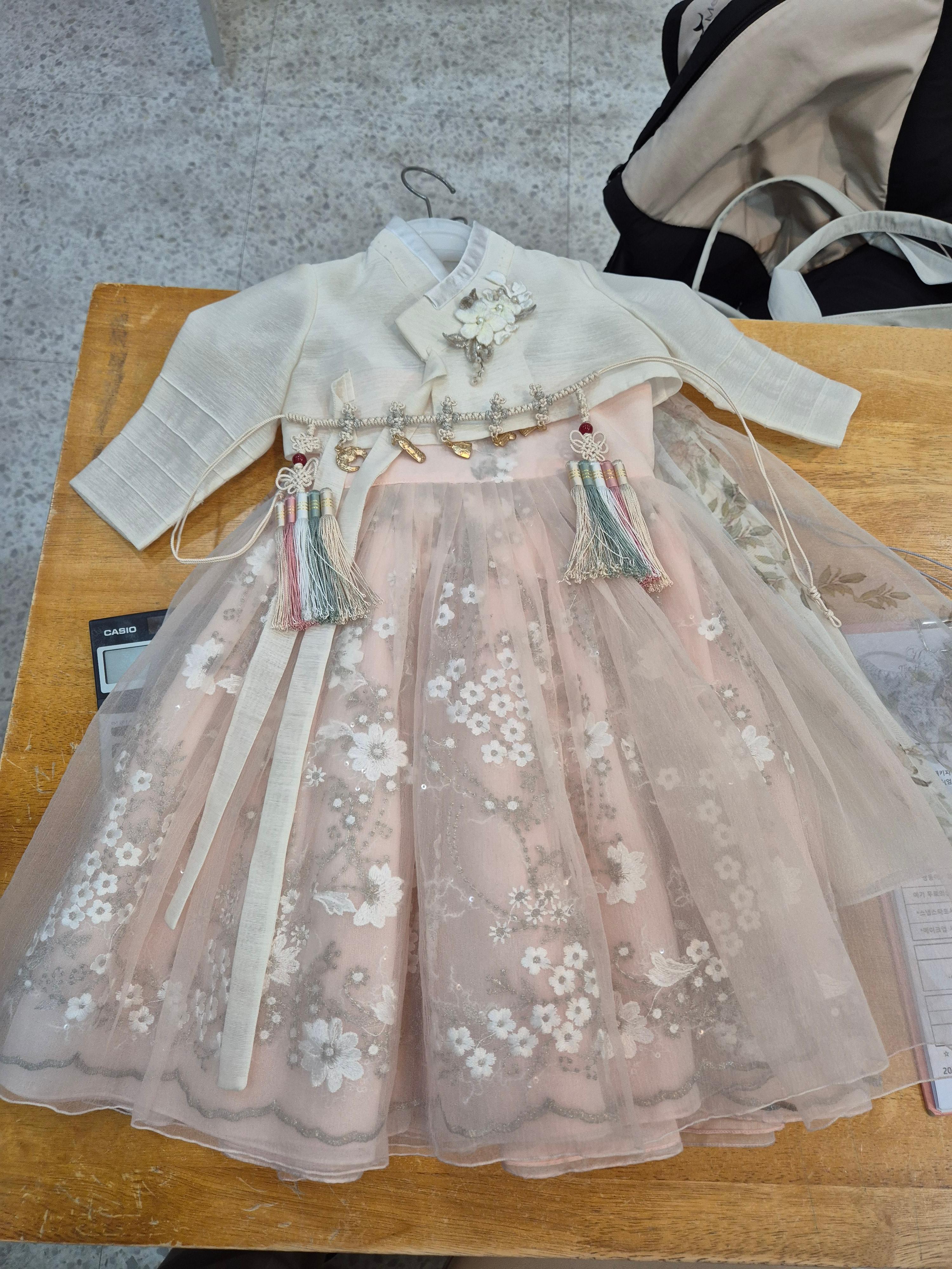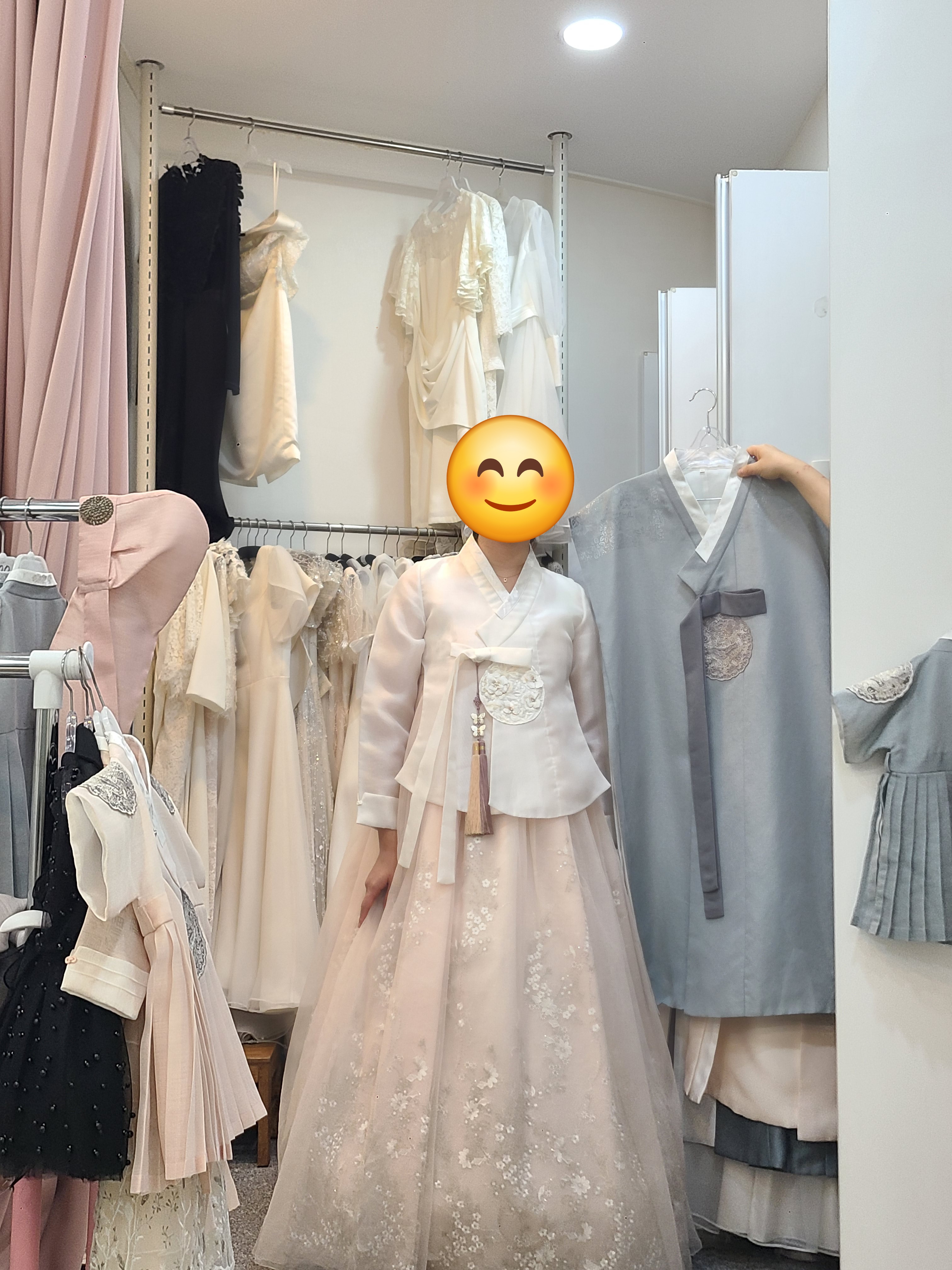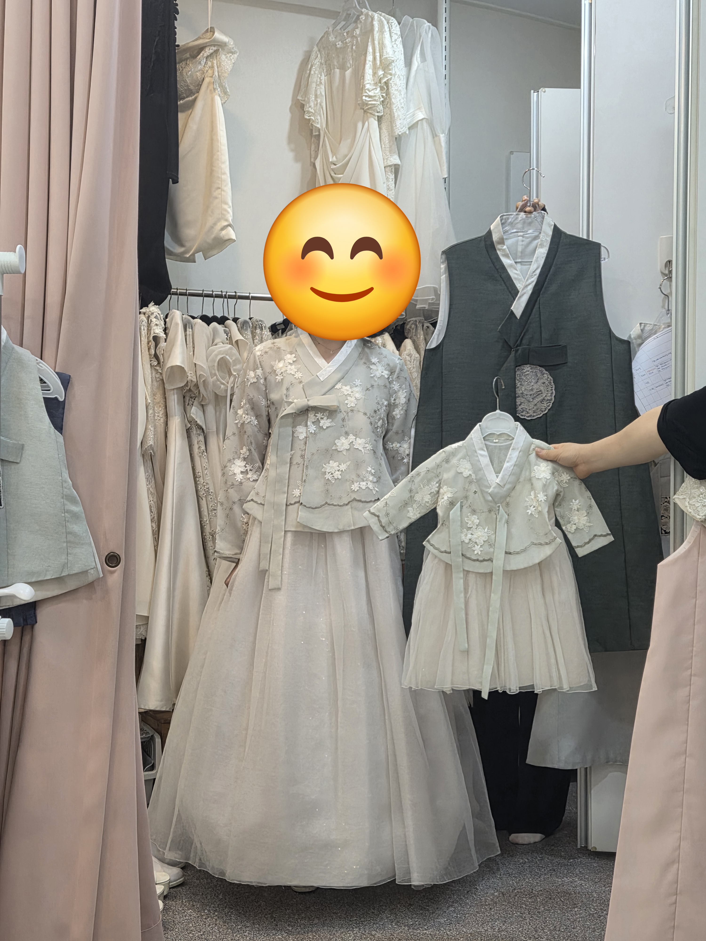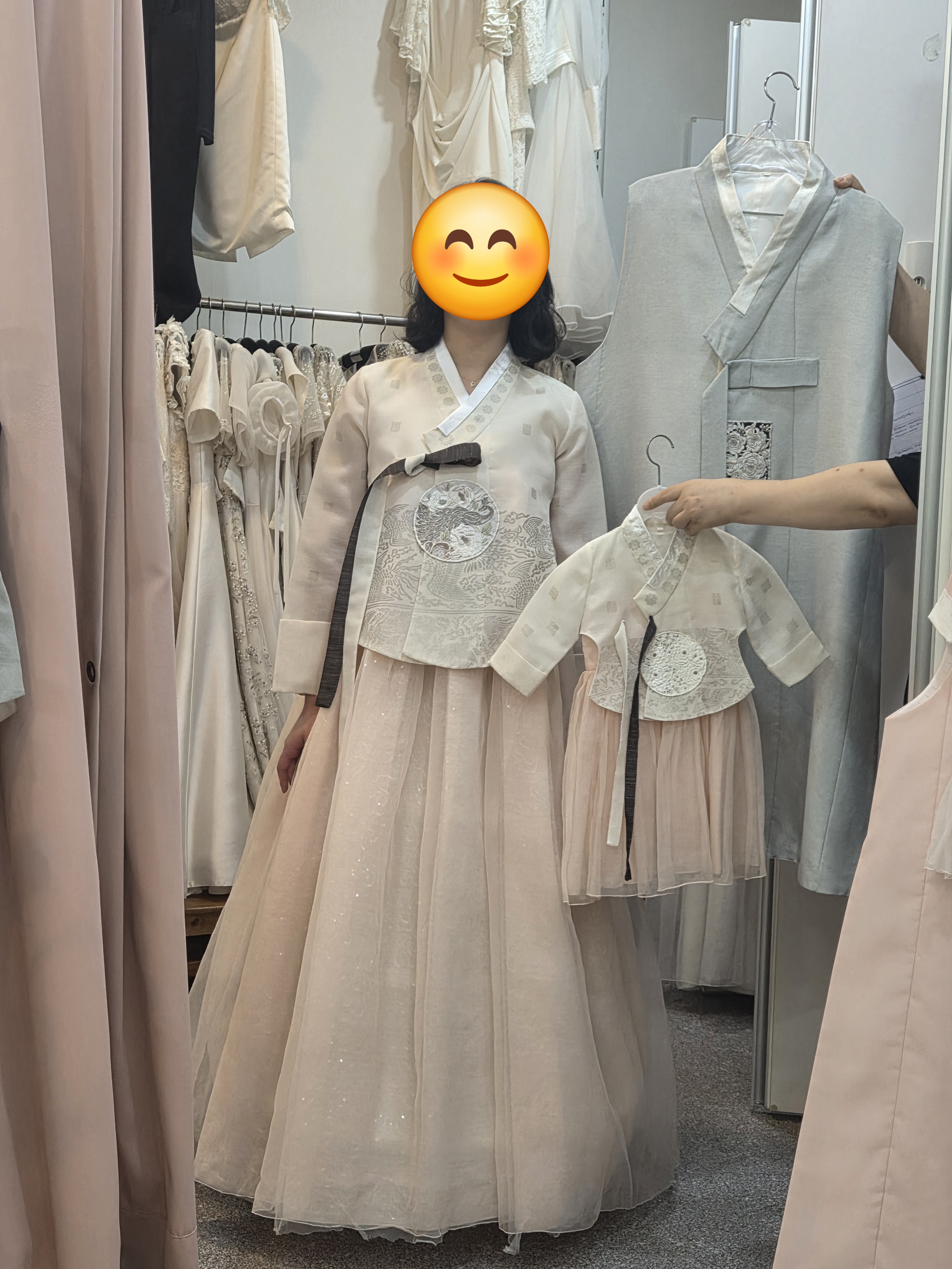 드레스와 한복 중에 선택할 수도 있고 추가금 내고 둘 다 할 수도 있는데 저는 한복만 했습니다. 처음에 계약할 때 전통돌상을 하기도 했고, 결혼식 때도 한복을 안 입어봐서 돌잔치 때 한복을 정말 입고 싶었어요. 한복은 일반과 프리미엄으로 나뉘는데 저는 일반 3벌, 프리미엄 1벌 입어보고 최종 프리미엄(맨 아래 사진)으로 선택했습니다. 추가금 10만 원이 더 붙기는 하지만 이왕 하는 거 두고두고 예쁜 한복이 좋으니까요 ㅎ ㅎ 더아너스 의상실에서 보유하고 있는 한복은 전체적으로 은은한 느낌이 많더라고요. 혹시 더 쨍한 색감이나 장식이 더 많은 걸 원하신다면 다른 한복집 피팅 해보는 것도 괜찮을 것 같습니다.